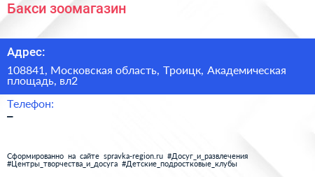 Бакси, зоомагазин по адресу 108841, Московская область, Троицк, Академическая площадь, вл2 в дальнейшем Организация, размещена в следующих категориях: