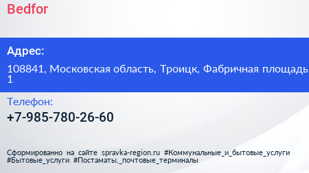 Bedfor по адресу 108841, Московская область, Троицк, Фабричная площадь, 1 в дальнейшем Организация, размещена в следующих категориях: