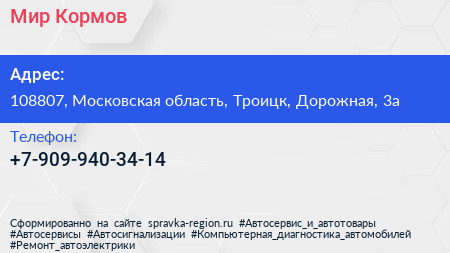 Мир Кормов по адресу 108807, Московская область, Троицк, Дорожная, 3а в дальнейшем Организация, размещена в следующих категориях: