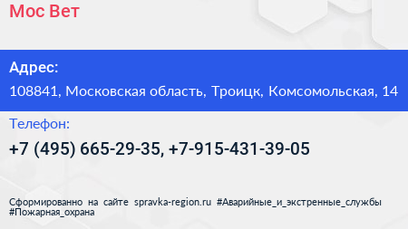 Мос Вет по адресу 108841, Московская область, Троицк, Комсомольская, 14 в дальнейшем Организация, размещена в следующих категориях: