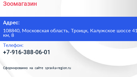 Зоомагазин по адресу 108840, Московская область, Троицк, Калужское шоссе 41 км, 8 в дальнейшем Организация, размещена в следующих категориях: