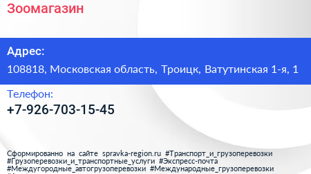 Зоомагазин по адресу 108818, Московская область, Троицк, Ватутинская 1-я, 1 в дальнейшем Организация, размещена в следующих категориях: