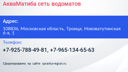 АкваМатиба, сеть водоматов по адресу 108836, Московская область, Троицк, Нововатутинская 6-я, 1 в дальнейшем Организация, размещена в следующих категориях: