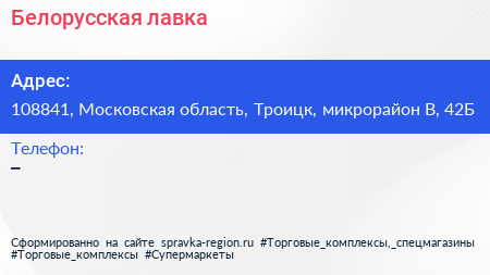 Белорусская лавка по адресу 108841, Московская область, Троицк, микрорайон В, 42Б в дальнейшем Организация, размещена в следующих категориях: