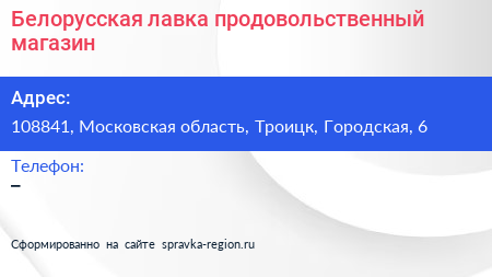 Белорусская лавка, продовольственный магазин по адресу 108841, Московская область, Троицк, Городская, 6 в дальнейшем Организация, размещена в следующих категориях:
