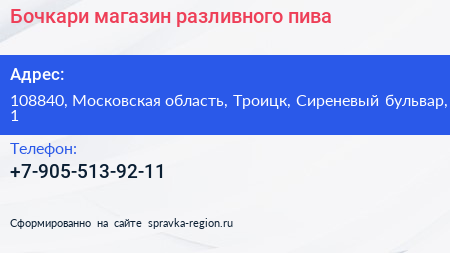 Бочкари, магазин разливного пива по адресу 108840, Московская область, Троицк, Сиреневый бульвар, 1 в дальнейшем Организация, размещена в следующих категориях: