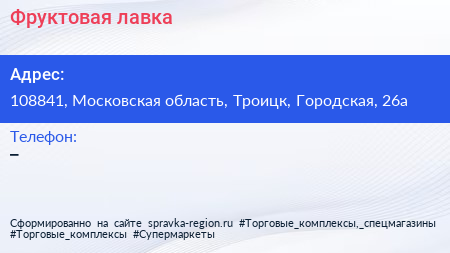 Фруктовая лавка по адресу 108841, Московская область, Троицк, Городская, 26а в дальнейшем Организация, размещена в следующих категориях: