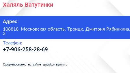 Халяль Ватутинки по адресу 108818, Московская область, Троицк, Дмитрия Рябинкина, 3 в дальнейшем Организация, размещена в следующих категориях: