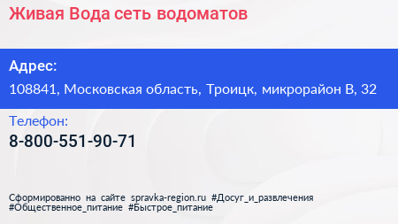 Живая Вода, сеть водоматов по адресу 108841, Московская область, Троицк, микрорайон В, 32 в дальнейшем Организация, размещена в следующих категориях: