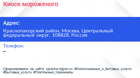 Киоск мороженого по адресу Краснопахорский район, Москва, Центральный федеральный округ, 108828, Россия в дальнейшем Организация, размещена в следующих категориях: