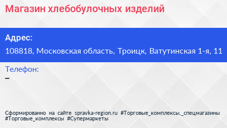 Магазин хлебобулочных изделий по адресу 108818, Московская область, Троицк, Ватутинская 1-я, 11 в дальнейшем Организация, размещена в следующих категориях: