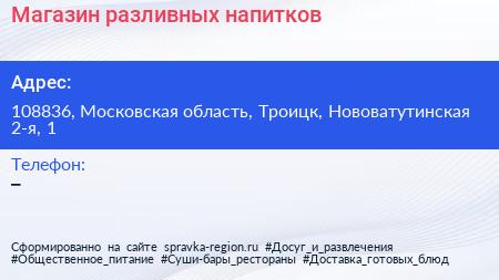 Магазин разливных напитков по адресу 108836, Московская область, Троицк, Нововатутинская 2-я, 1 в дальнейшем Организация, размещена в следующих категориях: