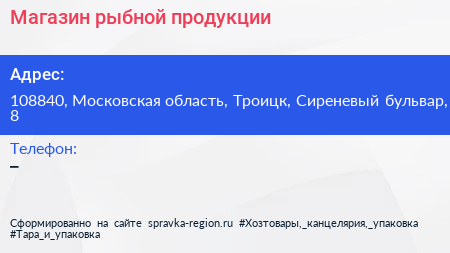 Магазин рыбной продукции по адресу 108840, Московская область, Троицк, Сиреневый бульвар, 8 в дальнейшем Организация, размещена в следующих категориях: