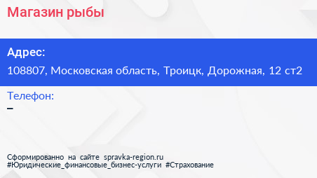 Магазин рыбы по адресу 108807, Московская область, Троицк, Дорожная, 12 ст2 в дальнейшем Организация, размещена в следующих категориях:
