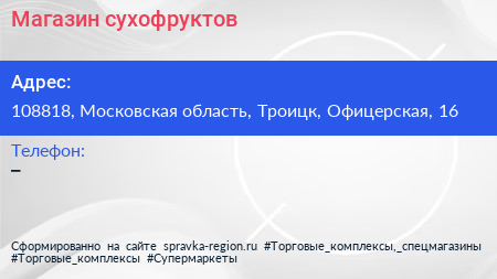 Магазин сухофруктов по адресу 108818, Московская область, Троицк, Офицерская, 16 в дальнейшем Организация, размещена в следующих категориях: