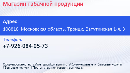 Магазин табачной продукции по адресу 108818, Московская область, Троицк, Ватутинская 1-я, 3 в дальнейшем Организация, размещена в следующих категориях: