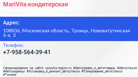 MariVita, кондитерская по адресу 108836, Московская область, Троицк, Нововатутинская 6-я, 3 в дальнейшем Организация, размещена в следующих категориях: