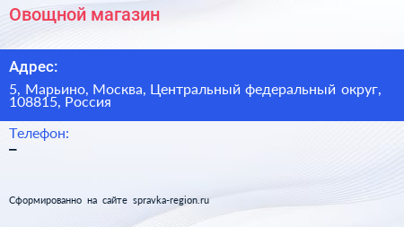 Овощной магазин по адресу 5, Марьино, Москва, Центральный федеральный округ, 108815, Россия в дальнейшем Организация, размещена в следующих категориях: