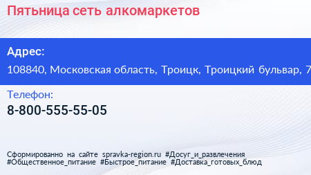 Пятьница, сеть алкомаркетов по адресу 108840, Московская область, Троицк, Троицкий бульвар, 7 в дальнейшем Организация, размещена в следующих категориях: