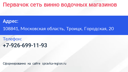 Первачок, сеть винно-водочных магазинов по адресу 108841, Московская область, Троицк, Городская, 20 в дальнейшем Организация, размещена в следующих категориях: