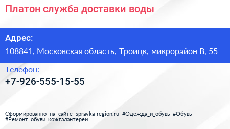 Платон, служба доставки воды по адресу 108841, Московская область, Троицк, микрорайон В, 55 в дальнейшем Организация, размещена в следующих категориях: