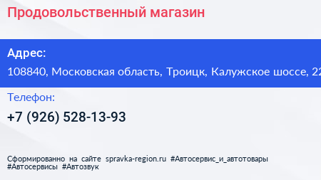 Продовольственный магазин по адресу 108840, Московская область, Троицк, Калужское шоссе, 22 в дальнейшем Организация, размещена в следующих категориях: