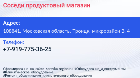 Соседи, продуктовый магазин по адресу 108841, Московская область, Троицк, микрорайон В, 4 в дальнейшем Организация, размещена в следующих категориях: