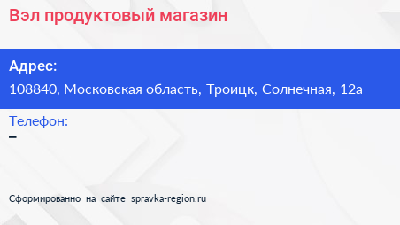 Вэл, продуктовый магазин по адресу 108840, Московская область, Троицк, Солнечная, 12а в дальнейшем Организация, размещена в следующих категориях: