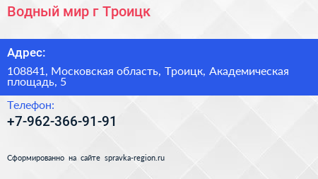 Водный мир, г. Троицк по адресу 108841, Московская область, Троицк, Академическая площадь, 5 в дальнейшем Организация, размещена в следующих категориях: