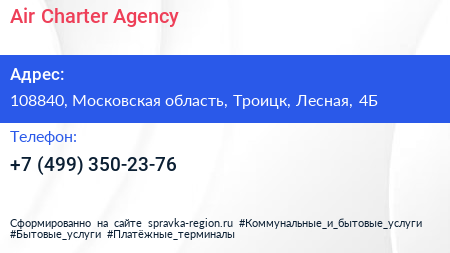 Air Charter Agency по адресу 108840, Московская область, Троицк, Лесная, 4Б в дальнейшем Организация, размещена в следующих категориях: