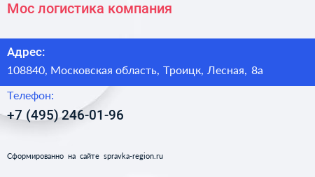Мос-логистика, компания по адресу 108840, Московская область, Троицк, Лесная, 8а в дальнейшем Организация, размещена в следующих категориях: