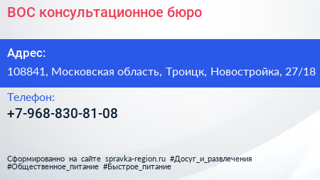 ВОС, консультационное бюро по адресу 108841, Московская область, Троицк, Новостройка, 27/18 в дальнейшем Организация, размещена в следующих категориях: