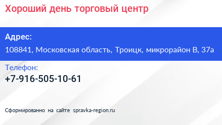 Хороший день, торговый центр по адресу 108841, Московская область, Троицк, микрорайон В, 37а в дальнейшем Организация, размещена в следующих категориях: