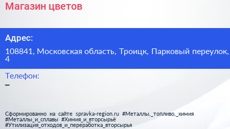 Магазин цветов по адресу 108841, Московская область, Троицк, Парковый переулок, 4 в дальнейшем Организация, размещена в следующих категориях: