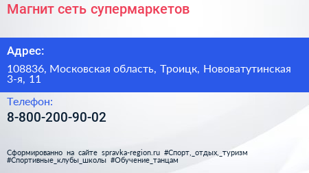 Магнит, сеть супермаркетов по адресу 108836, Московская область, Троицк, Нововатутинская 3-я, 11 в дальнейшем Организация, размещена в следующих категориях: