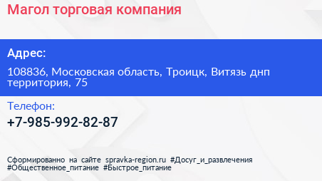 Магол, торговая компания по адресу 108836, Московская область, Троицк, Витязь днп территория, 75 в дальнейшем Организация, размещена в следующих категориях: