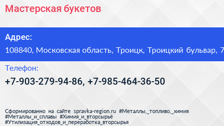 Мастерская букетов по адресу 108840, Московская область, Троицк, Троицкий бульвар, 7 в дальнейшем Организация, размещена в следующих категориях: