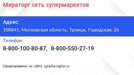 Мираторг, сеть супермаркетов по адресу 108841, Московская область, Троицк, Городская, 26 в дальнейшем Организация, размещена в следующих категориях: