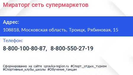 Мираторг, сеть супермаркетов по адресу 108818, Московская область, Троицк, Рябиновая, 15 в дальнейшем Организация, размещена в следующих категориях: