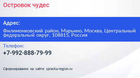 Островок чудес по адресу Филимонковский район, Марьино, Москва, Центральный федеральный округ, 108815, Россия в дальнейшем Организация, размещена в следующих категориях: