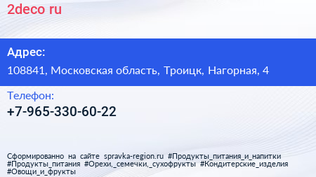 2deco.ru по адресу 108841, Московская область, Троицк, Нагорная, 4 в дальнейшем Организация, размещена в следующих категориях:
