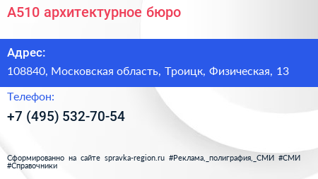 А510, архитектурное бюро по адресу 108840, Московская область, Троицк, Физическая, 13 в дальнейшем Организация, размещена в следующих категориях: