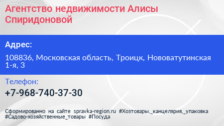 Агентство недвижимости Алисы Спиридоновой по адресу 108836, Московская область, Троицк, Нововатутинская 1-я, 3 в дальнейшем Организация, размещена в следующих категориях: