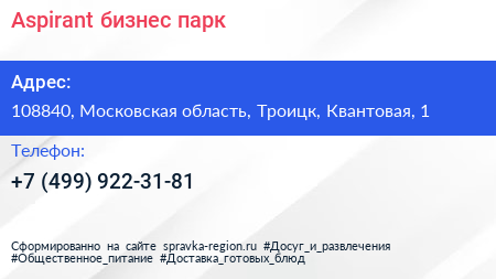 Aspirant, бизнес-парк по адресу 108840, Московская область, Троицк, Квантовая, 1 в дальнейшем Организация, размещена в следующих категориях: