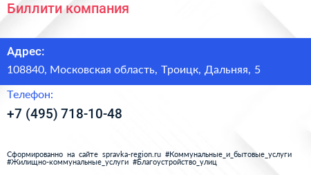 Биллити, компания по адресу 108840, Московская область, Троицк, Дальняя, 5 в дальнейшем Организация, размещена в следующих категориях:
