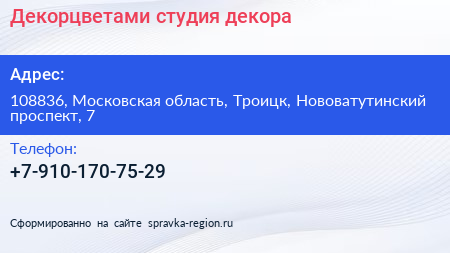 Декорцветами, студия декора по адресу 108836, Московская область, Троицк, Нововатутинский проспект, 7 в дальнейшем Организация, размещена в следующих категориях: