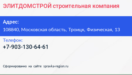 ЭЛИТДОМСТРОЙ, строительная компания по адресу 108840, Московская область, Троицк, Физическая, 13 в дальнейшем Организация, размещена в следующих категориях: