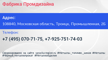Фабрика Промдизайна по адресу 108840, Московская область, Троицк, Промышленная, 2Б в дальнейшем Организация, размещена в следующих категориях: