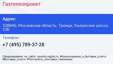 Газтеплопроект по адресу 108840, Московская область, Троицк, Калужское шоссе, 13Б в дальнейшем Организация, размещена в следующих категориях: