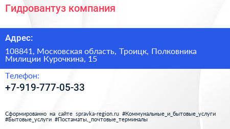 Гидровантуз, компания по адресу 108841, Московская область, Троицк, Полковника Милиции Курочкина, 15 в дальнейшем Организация, размещена в следующих категориях: